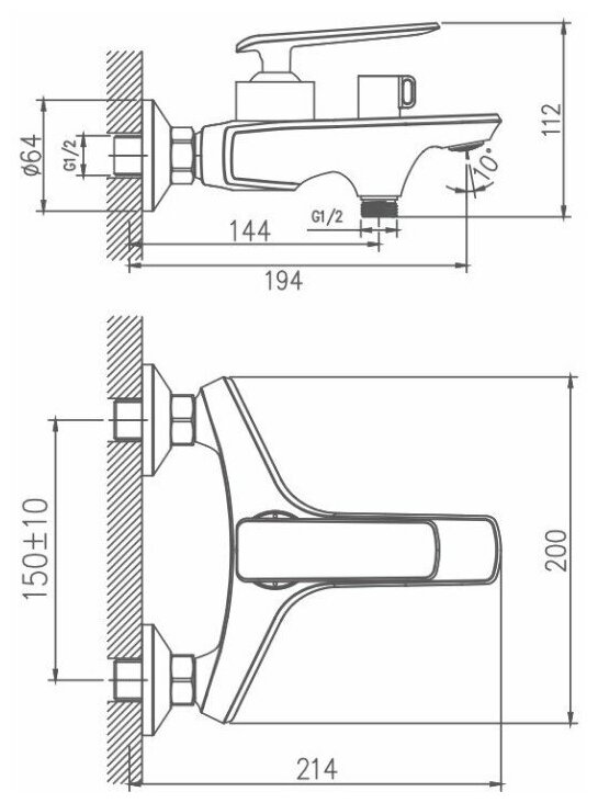 Смеситель на раковину настенный Эверест B46-350 с круглым поворотным изливом, кран-буксы 1/2", хром
