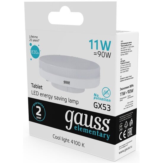 (2 шт)Лампа Gauss Elementary GX53 11W 830lm 4100K LED 1/10/100 1 060 ₽