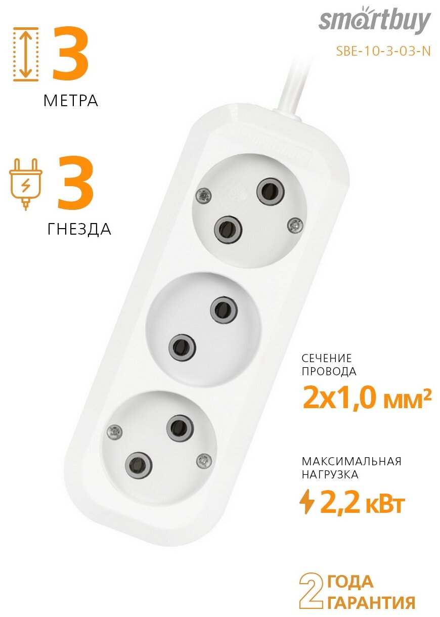 Отзывы на Удлинитель SmartBuy SBE-10-3-02-N, 3 розетки, 2 м, б/з, 10А / 2200 Вт