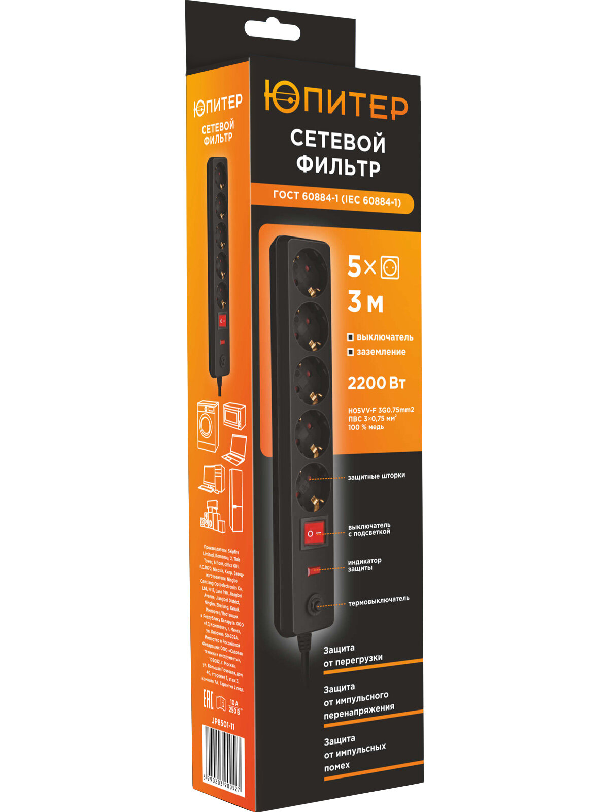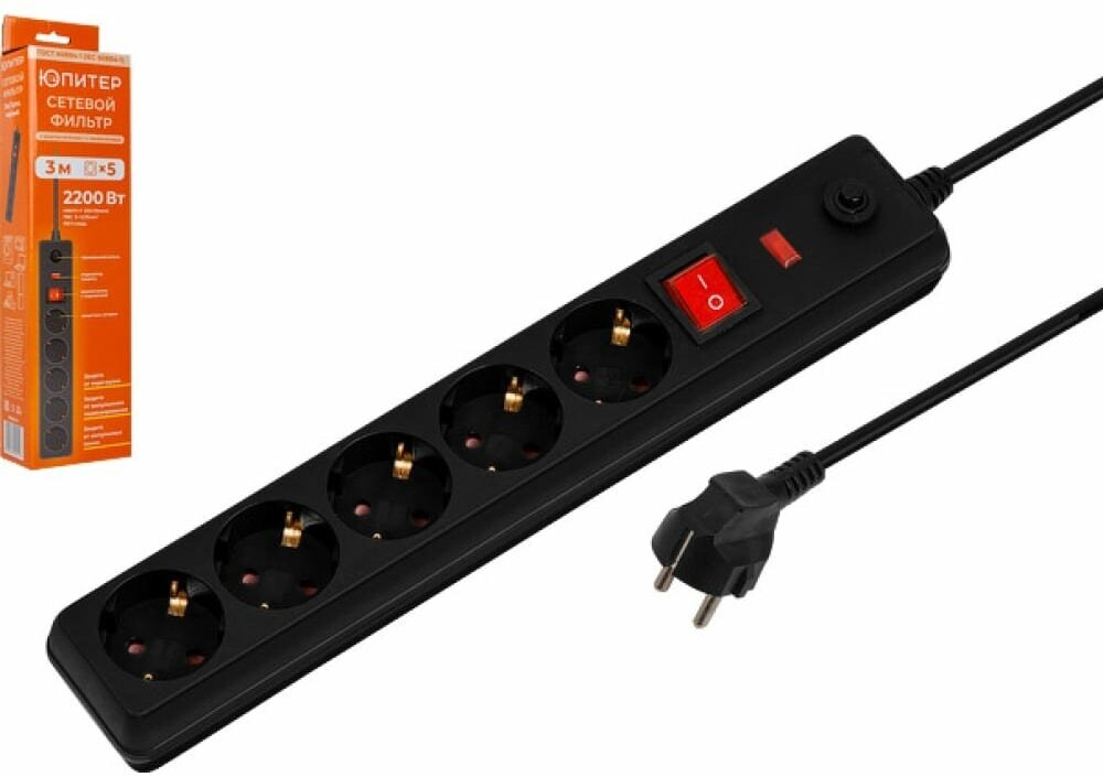 Фильтр сетевой 3м (5 роз., 2,2кВт, с/з, выкл, ПВС 3х0,75) черный Юпитер JP8501-11 информация:
