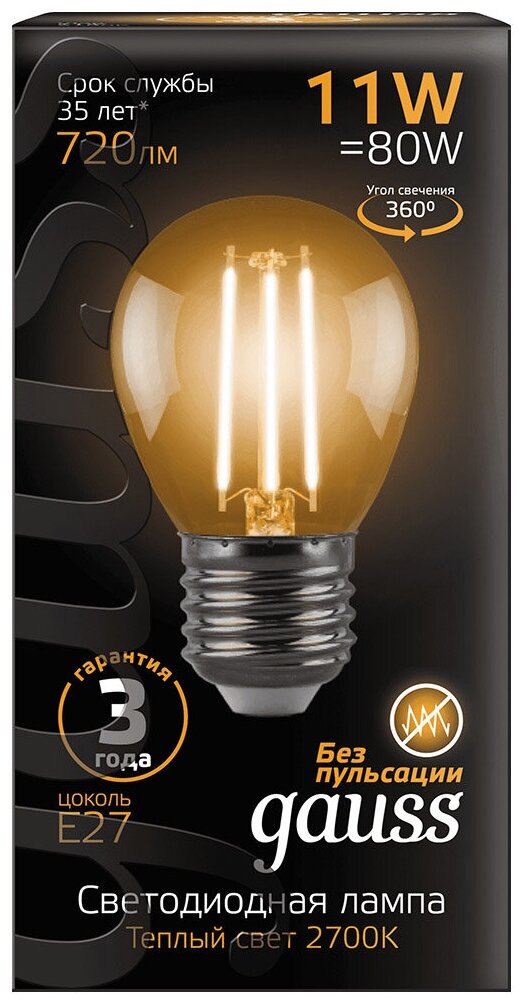 Отзывы на Упаковка ламп 10 штук Gauss Filament Шар 11W 810lm 2700К Е27 LED 1/10/50