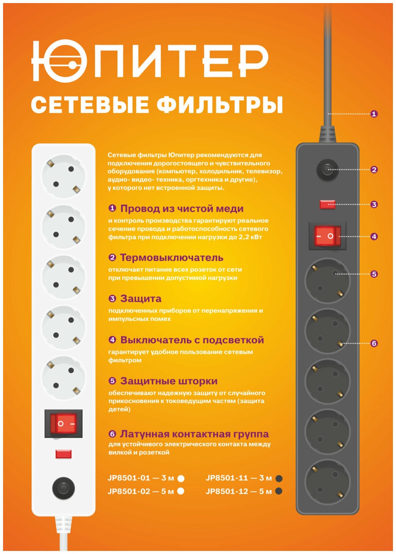 Фильтр сетевой 5м (5 роз., 2,2кВт, с/з, выкл, ПВС 3х0,75) черный Юпитер JP8501-12 информация: