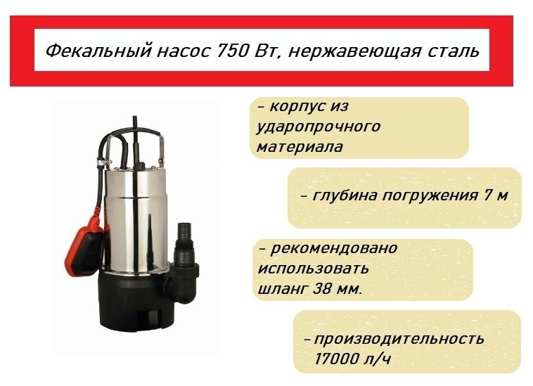 Фекальный насос/дренажный насос для грязной воды 750 Вт, 17000 л/ч, глубина погружения 7 м информация: