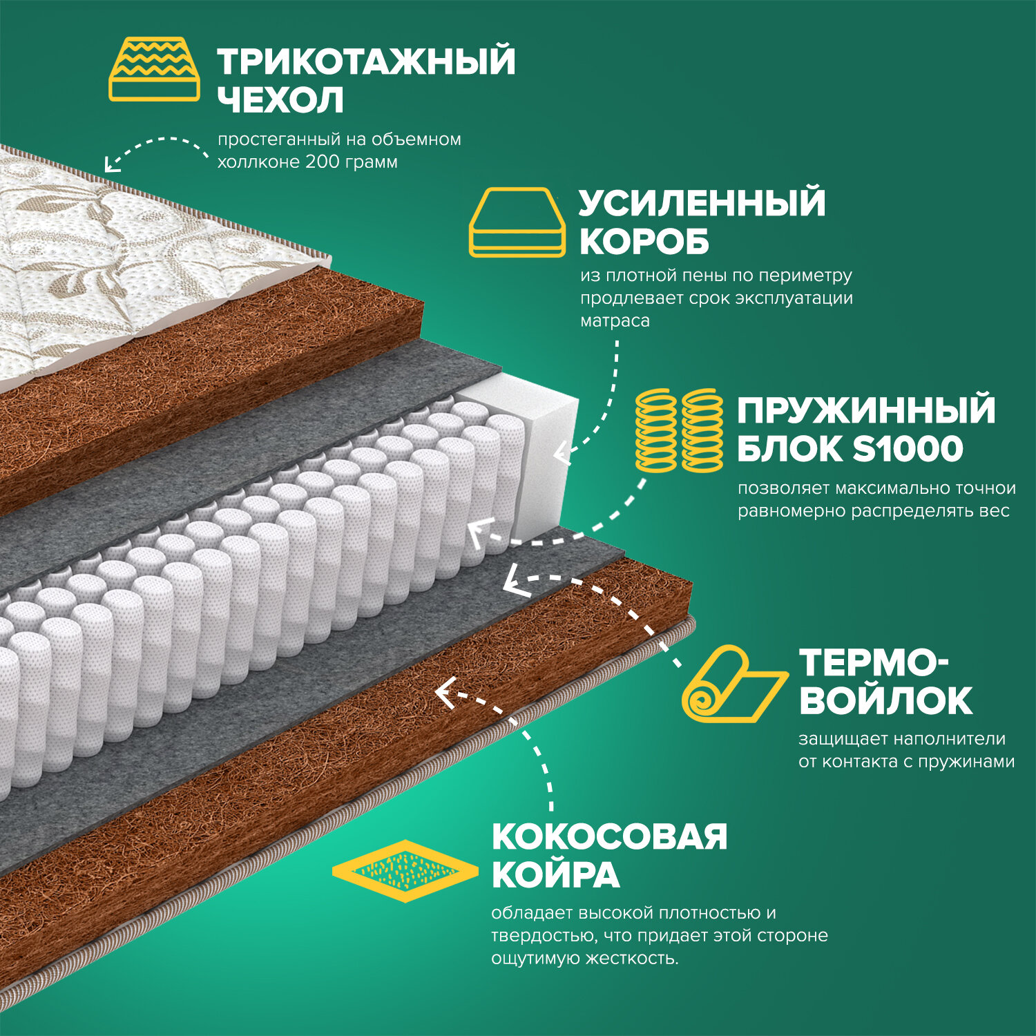 Фабрика Сна Матрас EDMOND, независимые пружины, кокос, средняя жесткость, анатомический, 90х200 см