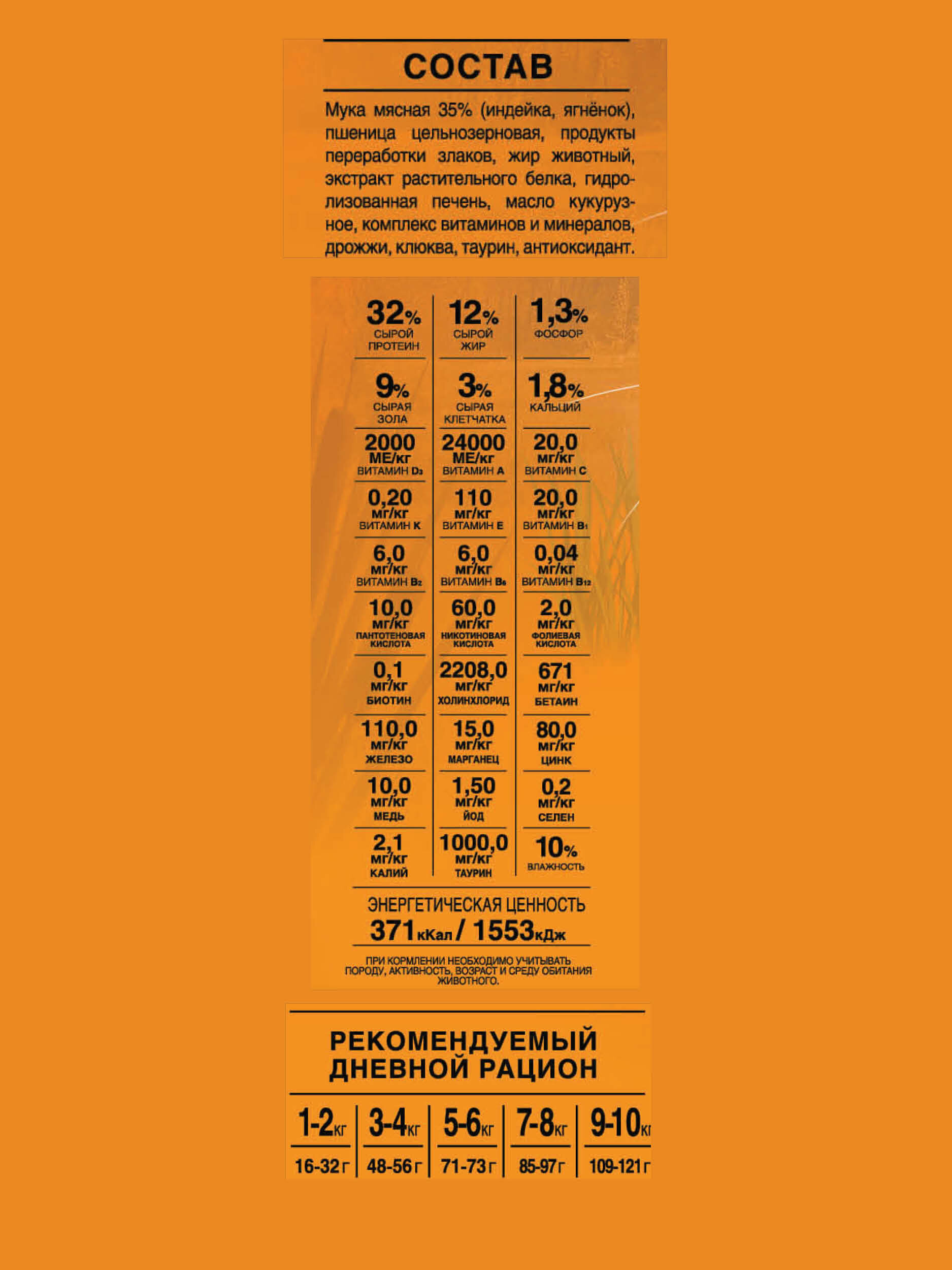 | Состав | Мука мясная – 35 % (индейка, ягнёнок), пшеница цельнозерновая, жир животный, экстракт белка растительного, печень гидролизованная, масло кукурузное, комплекс витаминов и минералов, дрожжи, экстракт клюквы, таурин, антиоксидант. |