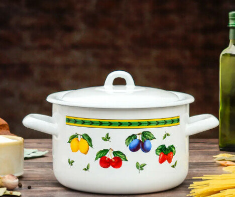 Кастрюля эмалированная 1,5 л с ободком белая с рисунком Фруктовая фантазия