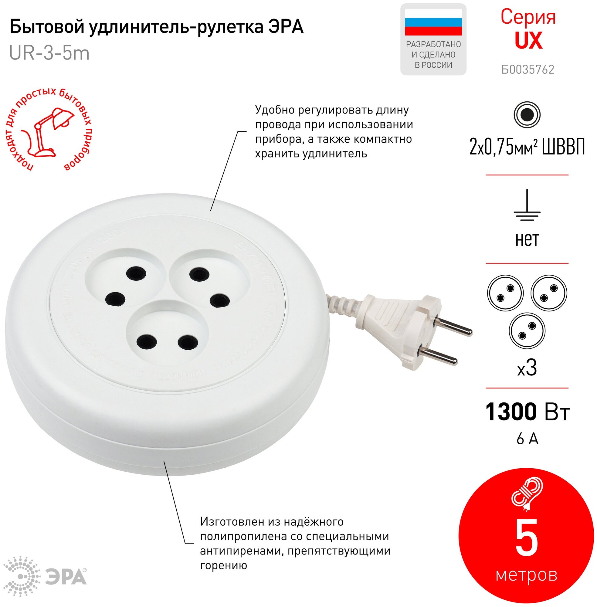 Отзывы на Удлинитель электрический ЭРА UR(6)-3-5m рулетка без заземления 3 розетки 5м ШВВП 2x0,75мм2 6А