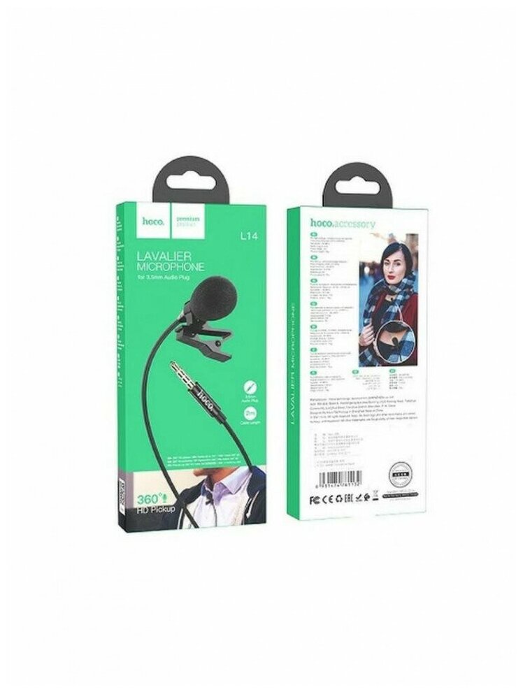 Петличный микрофон Hoco L14, разъем 3.5 мм, 2 м, чёрный