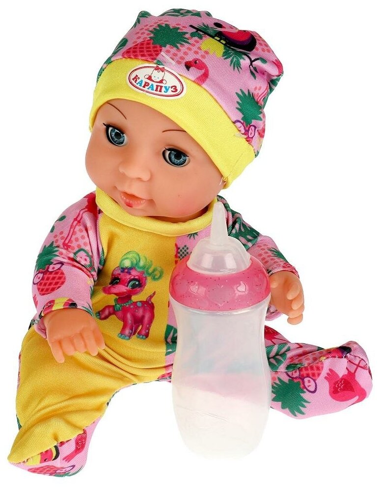 10 цен на Пупс Карапуз, озвученный Оленька 20см, пьет, пис, закрывает глаза, 50 звуков, 3 аксессуара