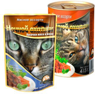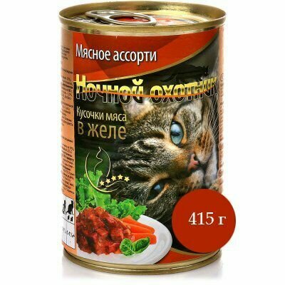 Корм для кошек влажный Ночной охотник для взрослых животных, кусочки в желе из мясного ассорти 415г информация: