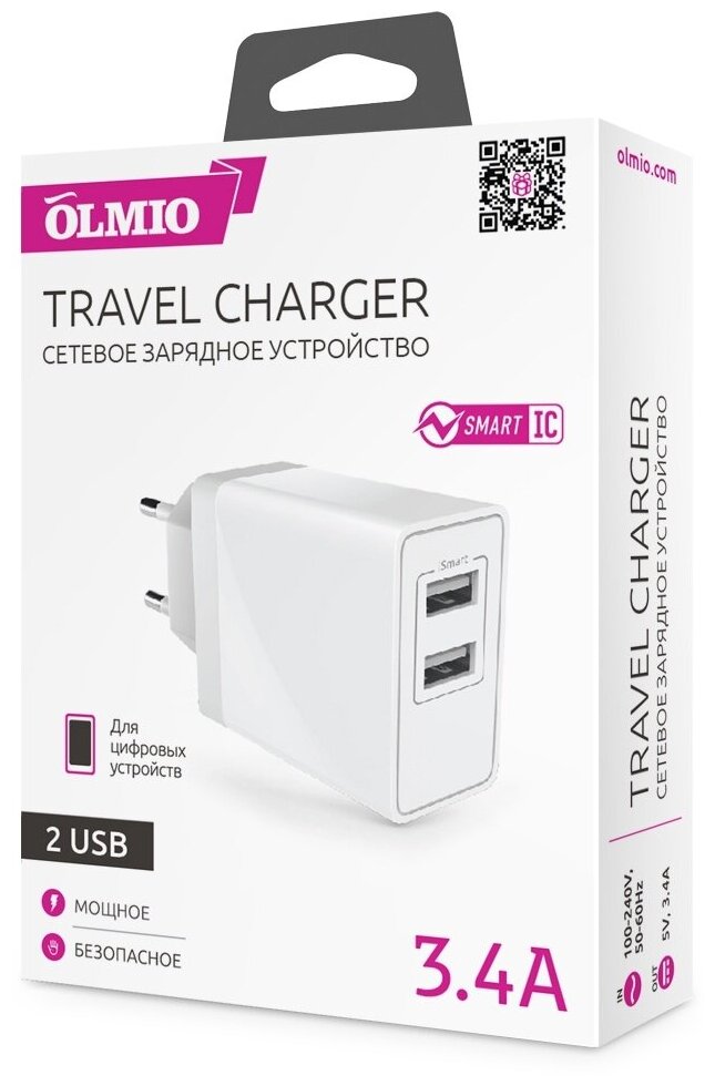Сетевое Зарядное Устройство для телефона 2USB, 3.4A, Smart IC, черный, OLMIO информация: