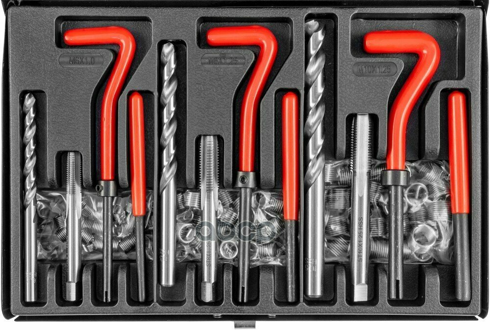 | Подробная комплектация | сверло спиральное по металлу 3 шт; метчик STI по DIN 8140-2: 3 шт; вороток установочный (с предохранительным кольцом для ограничения глубины): 3 шт; демонтажная оправка (для удаления поводка): 3 шт; ключ торцевой шестигранный; резьбовые вставки (M6x1.0, M8x1.25, M10x1.5): 75 шт |