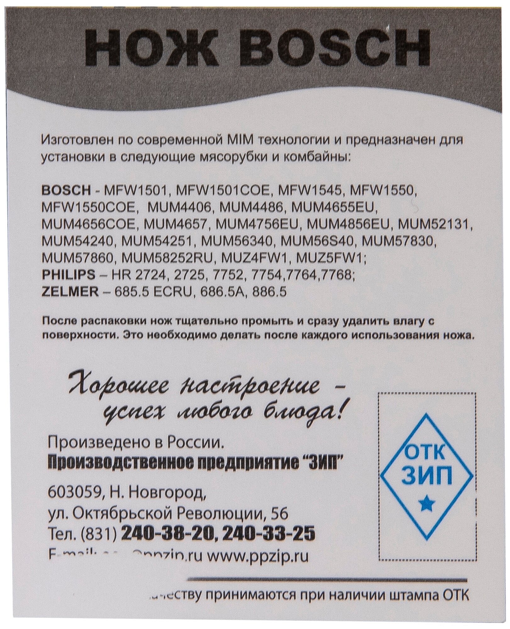 Нож для мясорубки Bosch, Philips, Zelmer (1 шт.) информация: