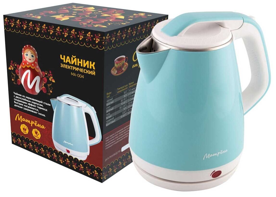 Чайник матрёна MA-004 электрический (1,8 л) стальной бело-голубой, двойной корпус