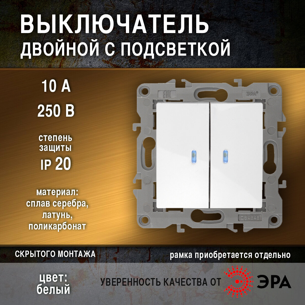Выключатель двухклавишный с подсветкой ЭРА Elegance 10AX 250V 14-1105-01 Б0034237 информация: