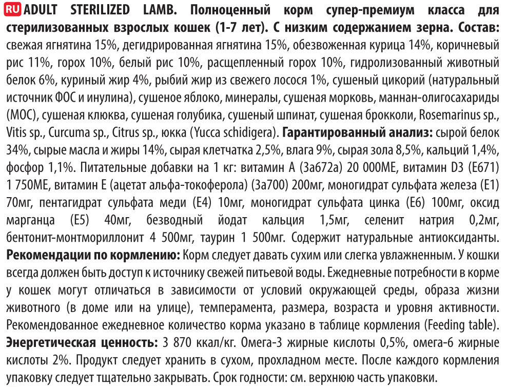 | Состав | 15% свежее мясо ягненка, 15% сухое мясо ягненка, 14% сушеного куриного мяса, 11% коричневый рис, 10% горох, 10% белого риса, 10% пополам горох, 6% гидролизованный животных белка, 4%, куриный жир, 1% свежего масла лосося, порошок цикория (естественный источник FOS и inulinu), сушеные яблоки, минералы, сушеные морковь, MOS (mananoligosacharidy), сушеная клюква, сушеная черника, сушеный шпинат, сушеный брокколи, розмарин, виноград, куркума, цитрусовые, юкка schidigera |