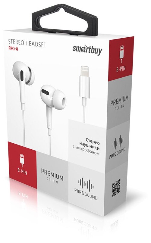 Наушники-вкладыши с микрофоном SmartBuy Pro-8, 8pin (Lightning), 2 пары сменных амбушюр, 1,1м, белый