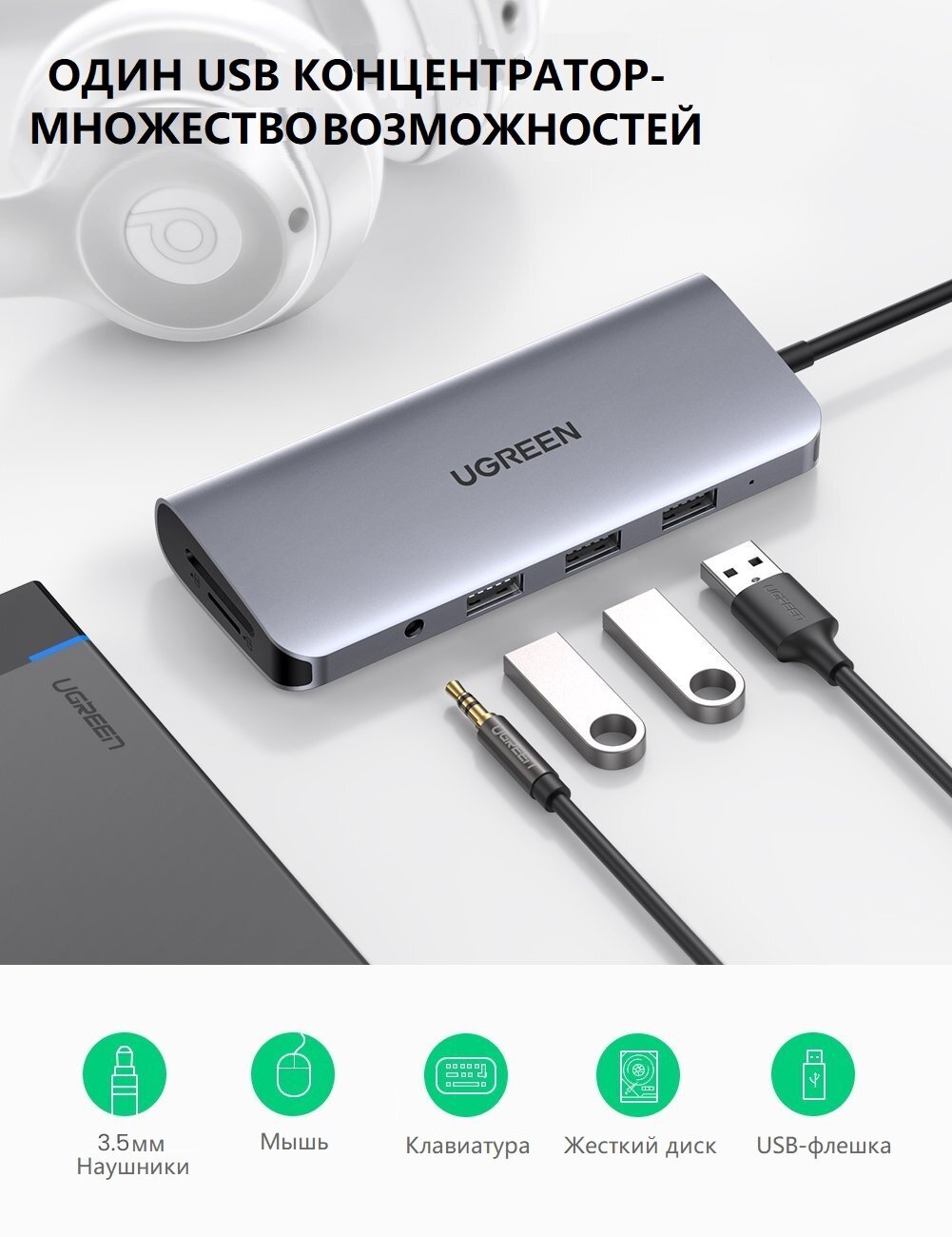 Адаптер Ugreen 80133 USB Type-C хаб 10 в 1 VGA/HDMI/RJ45/SD/USB 3.0/3,5мм информация: