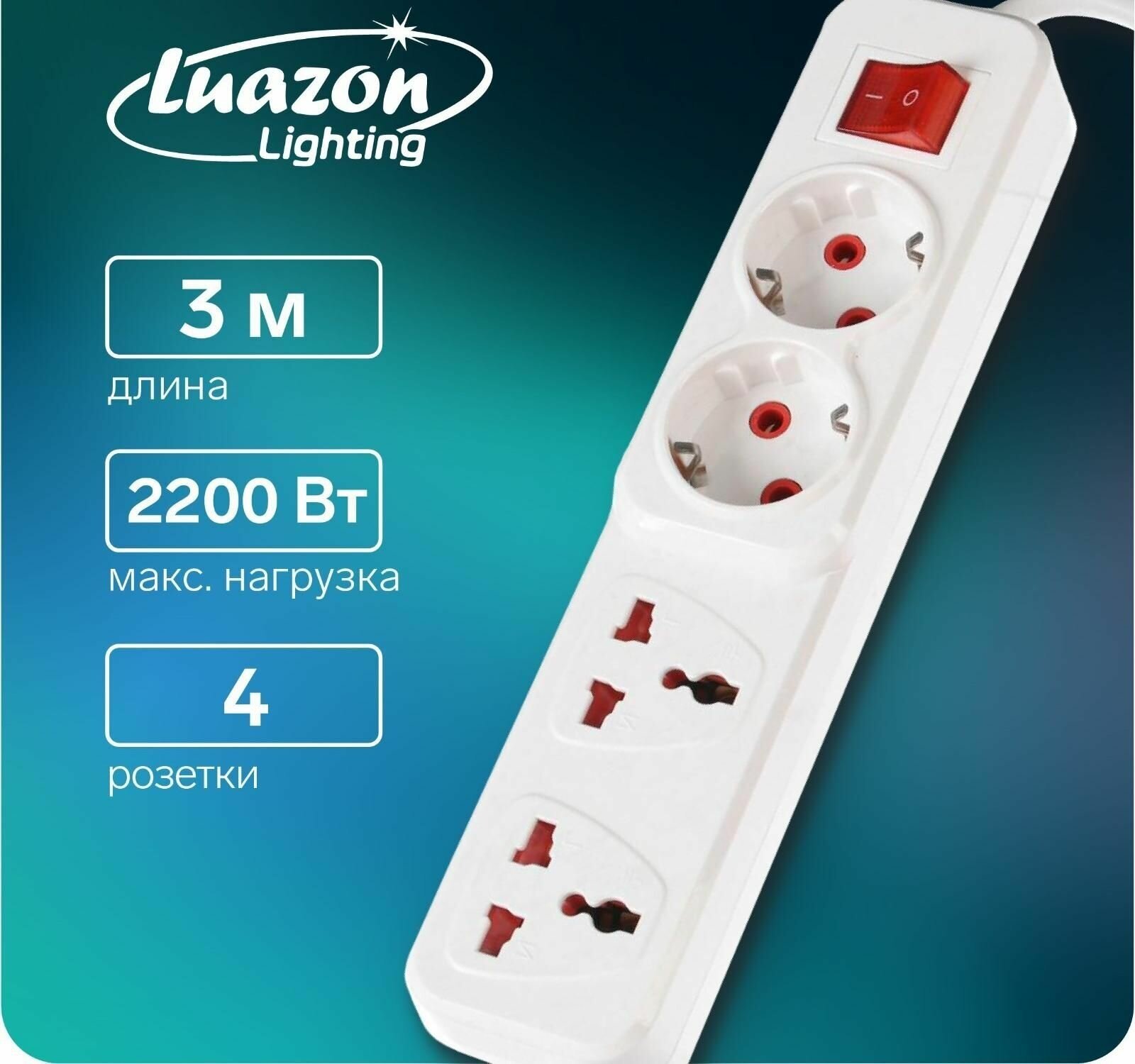 Luazon Lighting Удлинитель Luazon Lighting, 2 евро+2 унив.роз., 3 м, 2200 Вт, 2х0.5 мм2, с выкл., белый информация: