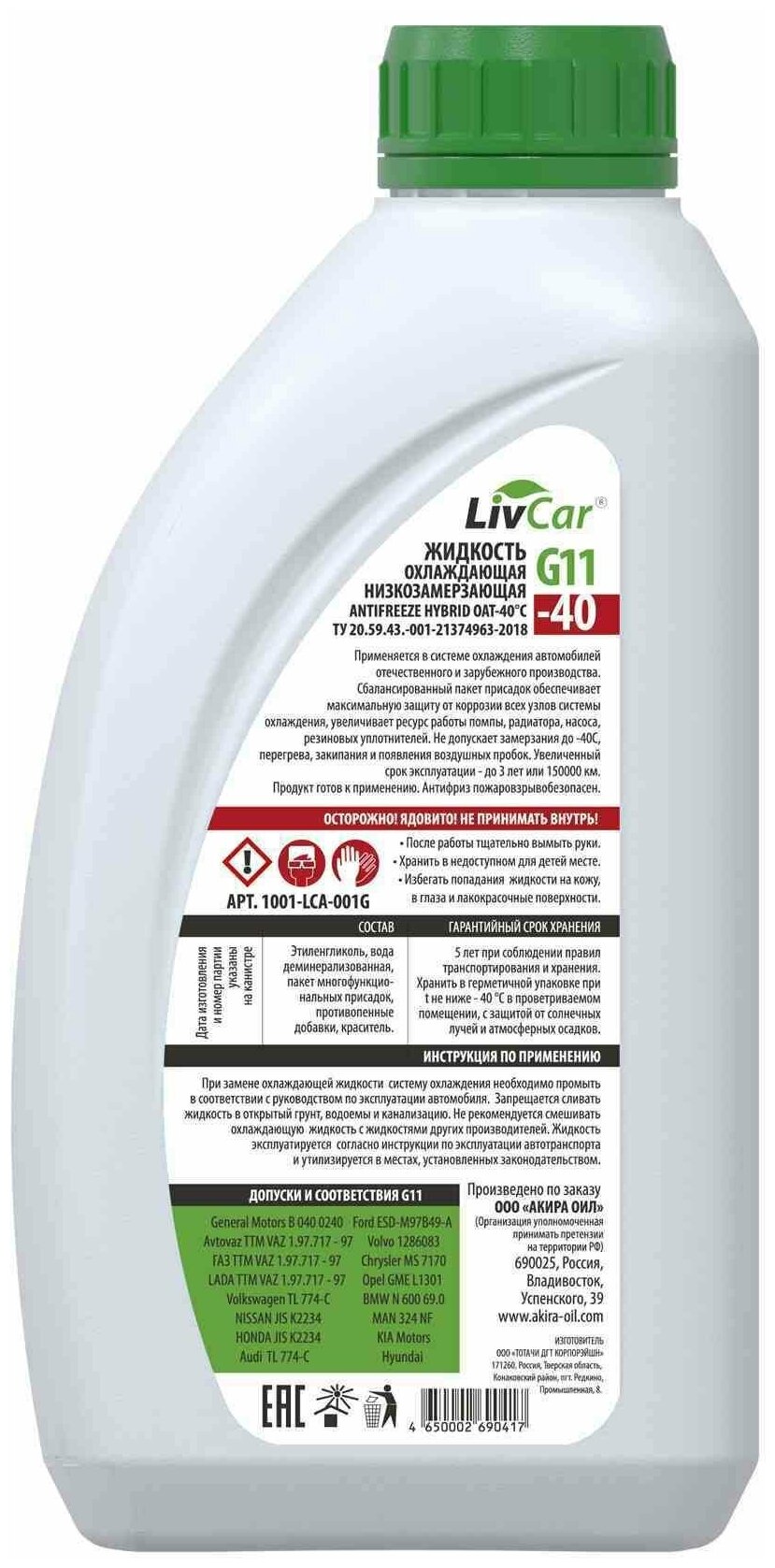 Антифриз G11 (-40c) Зеленый (1кг) LivCar арт. 1001LCA001G информация: