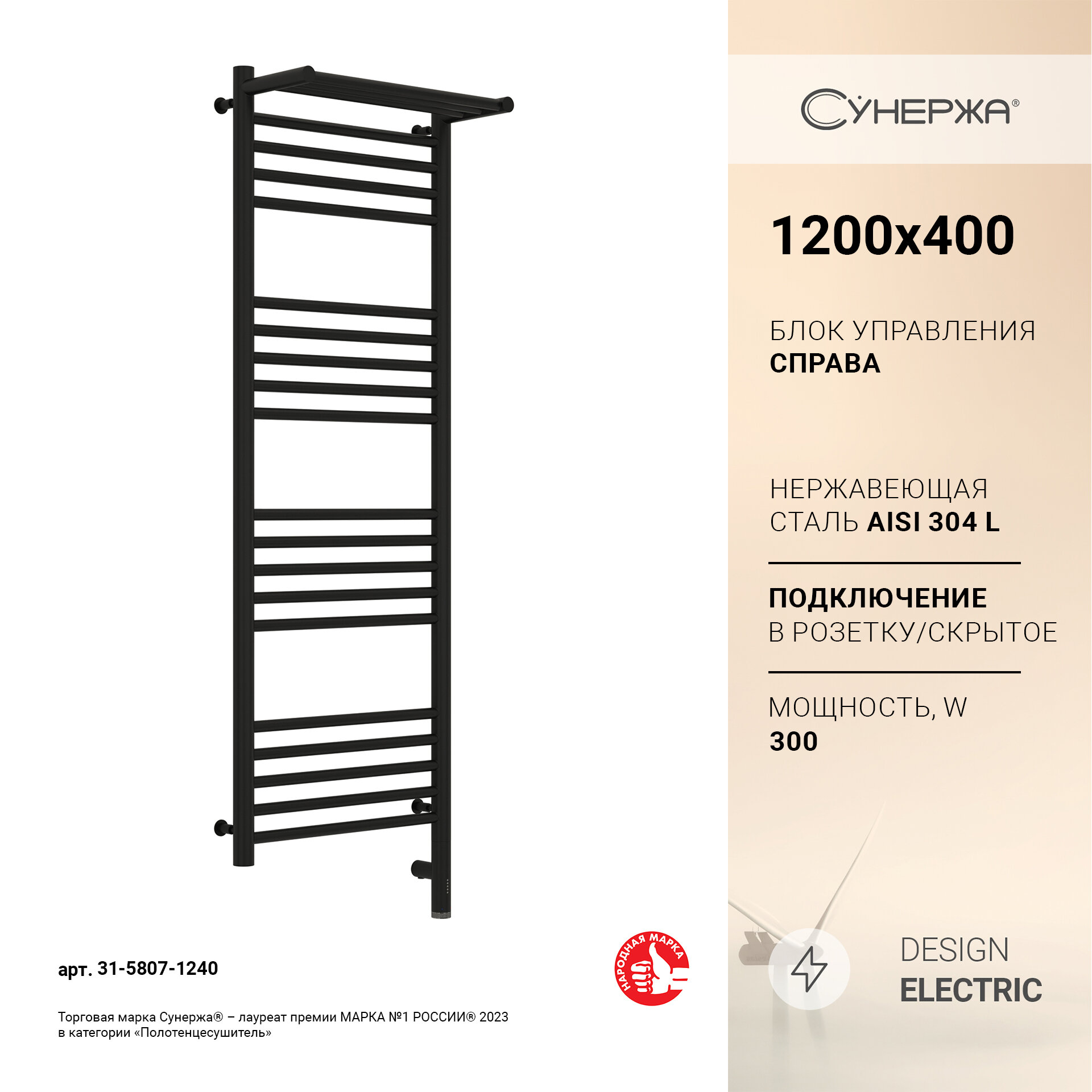 Полотенцесушитель электрический Сунержа Богема с полкой 3.0 1200х400 / МЭМ правый Матовый чёрный информация: