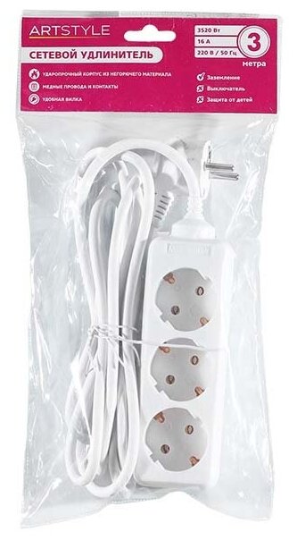 Отзывы на ARTSTYLE CL-C33GW Сетевой удлинитель белый, 3 гнезда, длина провода 3м, 220В, 16А, с заземлением, без выключателя