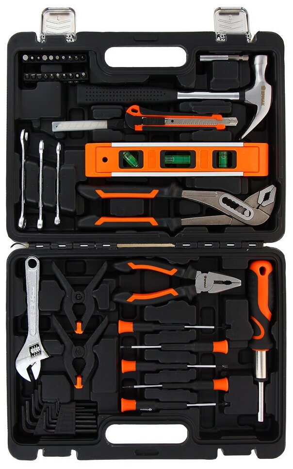 | Инструменты в комплекте | клещи / клещи переставные / ключ разводной / ключи имбусовые (шестигранные) / молоток / отвёртки / пассатижи / струбцина / биты / держатель для бит / комбинированный ключ / нож / переходник / Уровень |