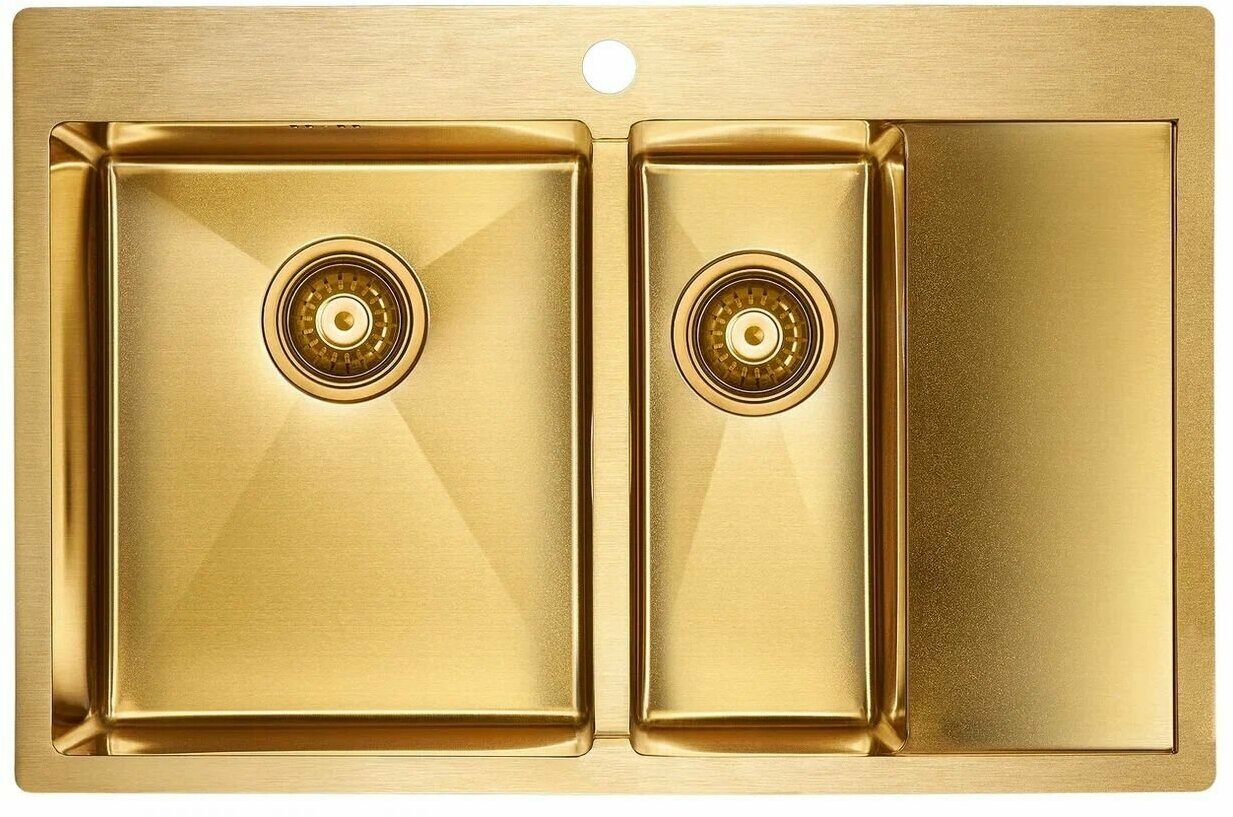 Мойка для кухни из нержавеющей стали Paulmark KRONER 78/2SF, 780х510 мм, мойка слева, PVD покрытие, отверстие под смеситель, врезная / вровень со столешницей, цвет брашированное золото 40 900 ₽