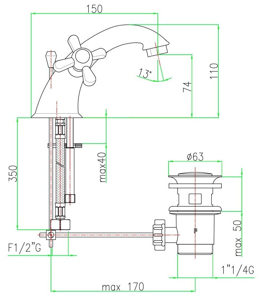 | Комплектация | смеситель - 1 шт., донный клапан - 1 шт., гибкая подводка - 2 шт. |