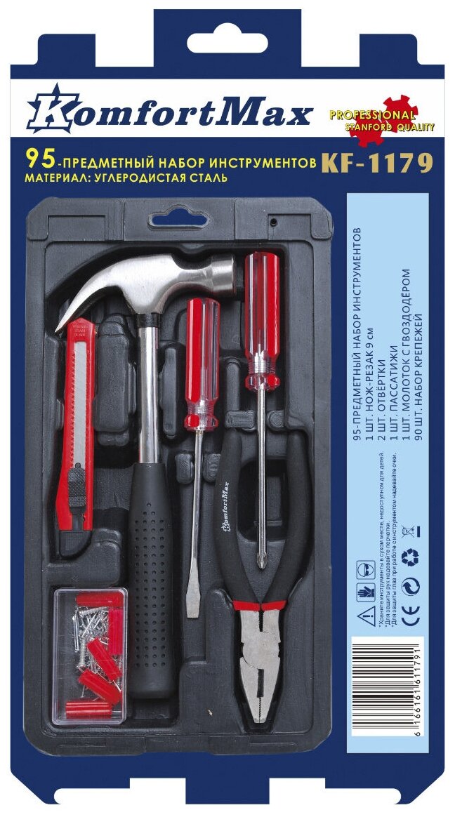 10 цен на Набор инструментов 95 предметов универсальный Komfort Max Подарок мужчине отвертки, пассатижи, нож-резак, молоток с гвоздодером, набор крепежей