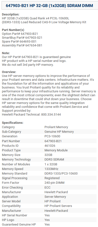 Память 647903-B21 HP 32GB PC3L-10600L Load Reduced информация: