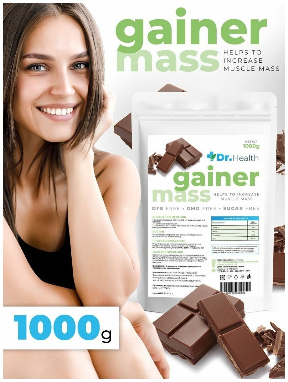 Dr. Health Гейнер высокоуглеводный быстрый со вкусом Шоколад 1000г информация: