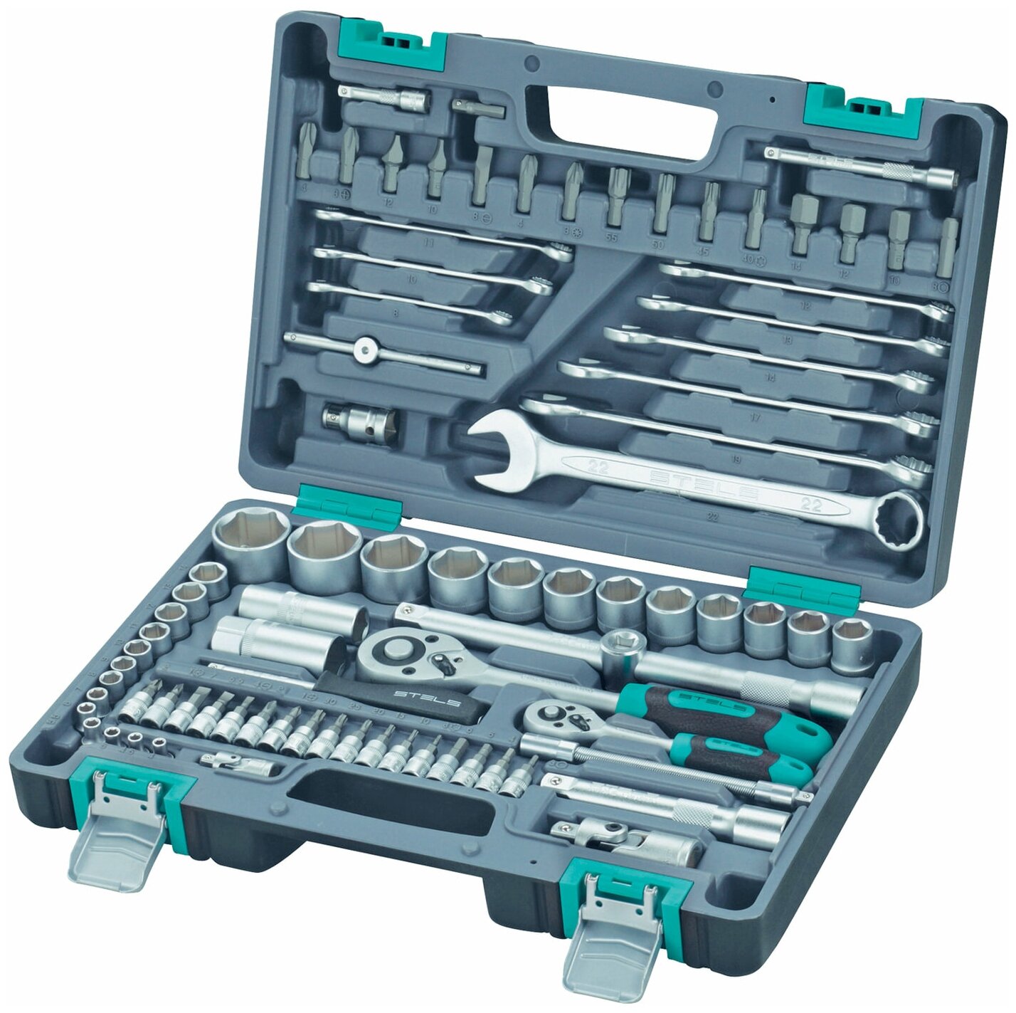 Набор инструментов, 1/2, 1/4, CrV, пластиковый кейс, 82 предмета Stels STELS