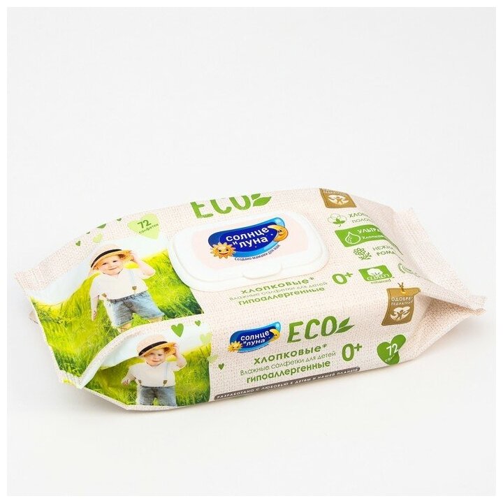 Влажные салфетки, Солнце и Луна, ECO детские 0+ , хлопковые, нежное алоэ и Д-пантенол, 63 шт, 3 уп