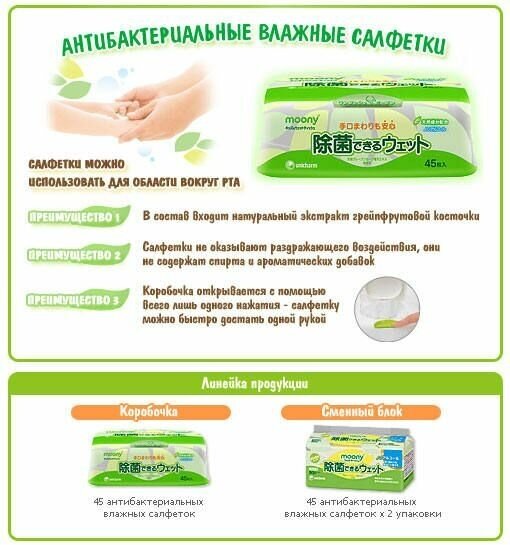 Детские влажные антибактериальные салфетки Moony, сменный блок, 45 шт. информация: