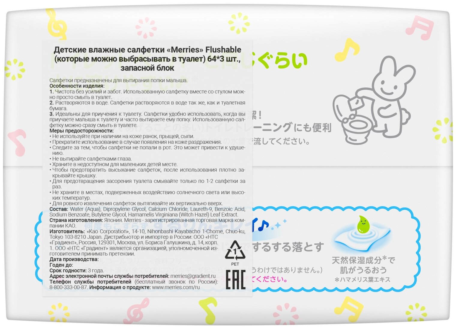 MERRIES Детские влажные салфетки Flushable бумажные с противовоспалительным лосьоном, запасной блок, 192 шт. спайка 3 уп * 64 шт.