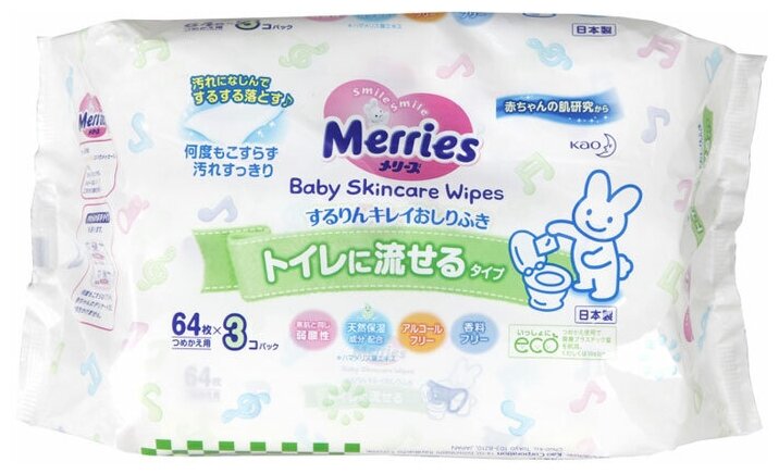MERRIES Детские влажные салфетки Flushable , Запасной блок. 64 шт.