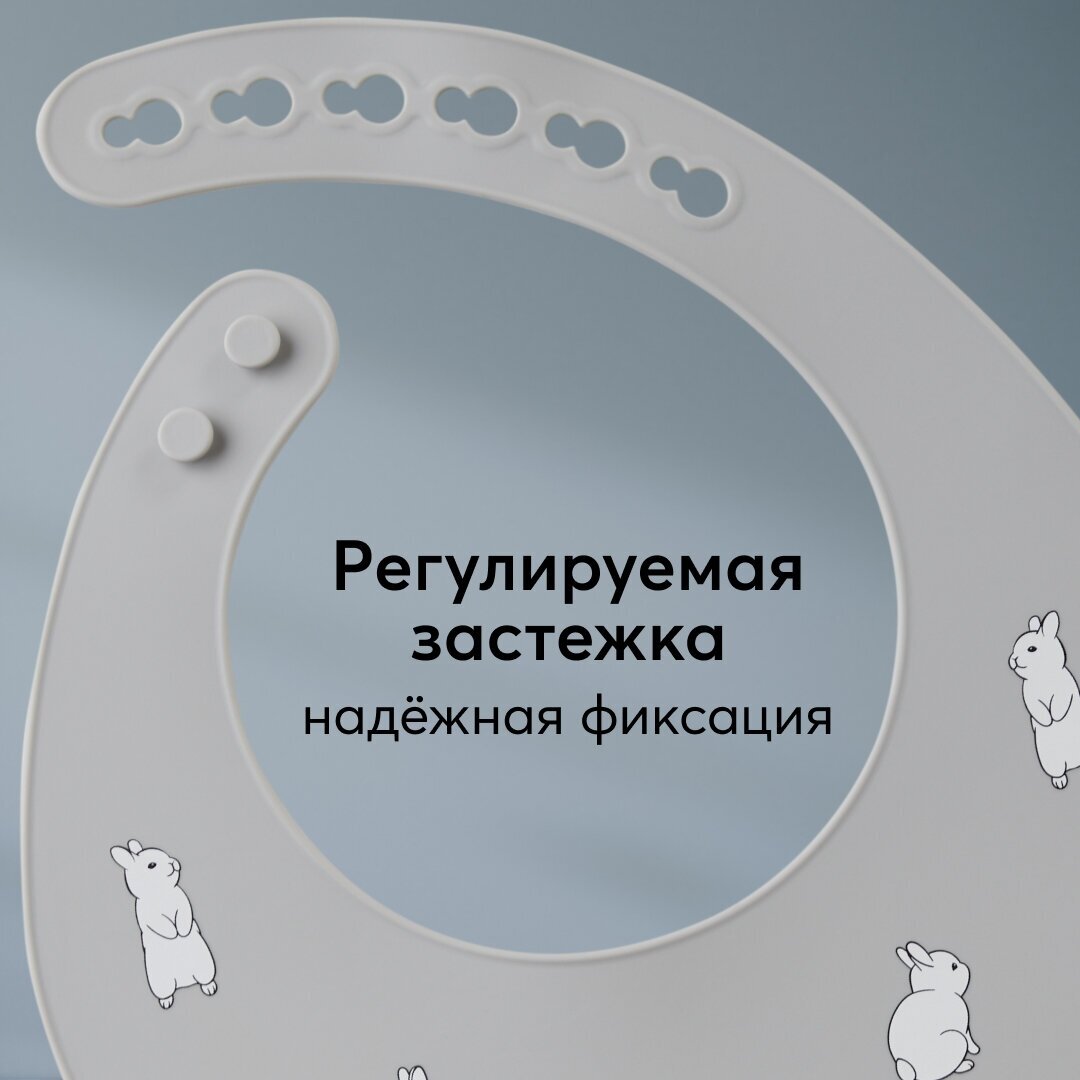 10 цен на 16017, Нагрудник для кормления Happy Baby, слюнявчик силиконовый с кармашком, мягкий, серый с кроликами