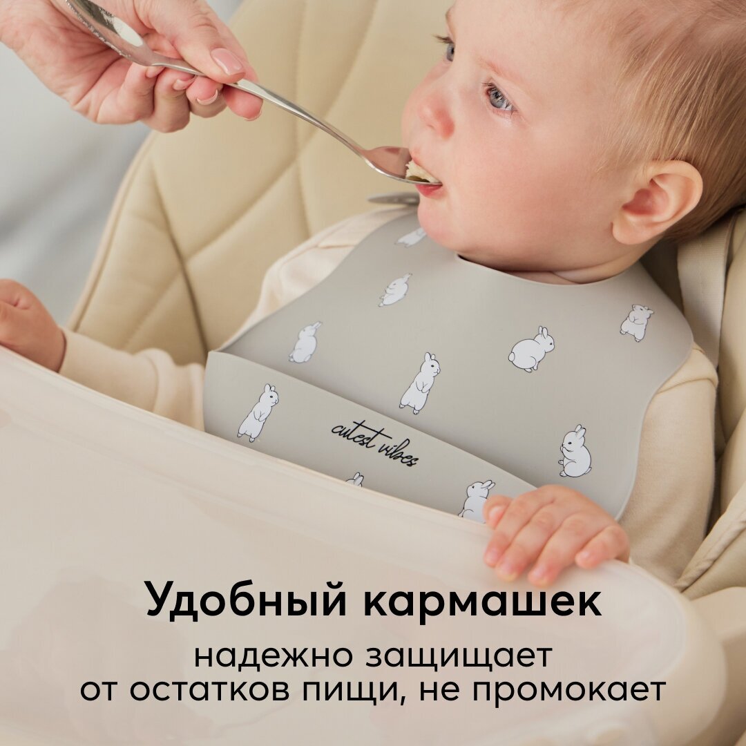 Отзывы на 16017, Нагрудник для кормления Happy Baby, слюнявчик силиконовый с кармашком, мягкий, серый с кроликами