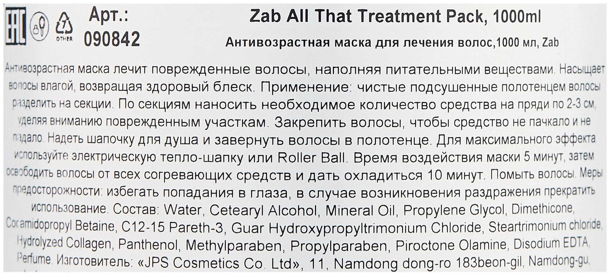Антивозрастная маска для лечения волос Zab All That Treatment Pack,1000 мл информация:
