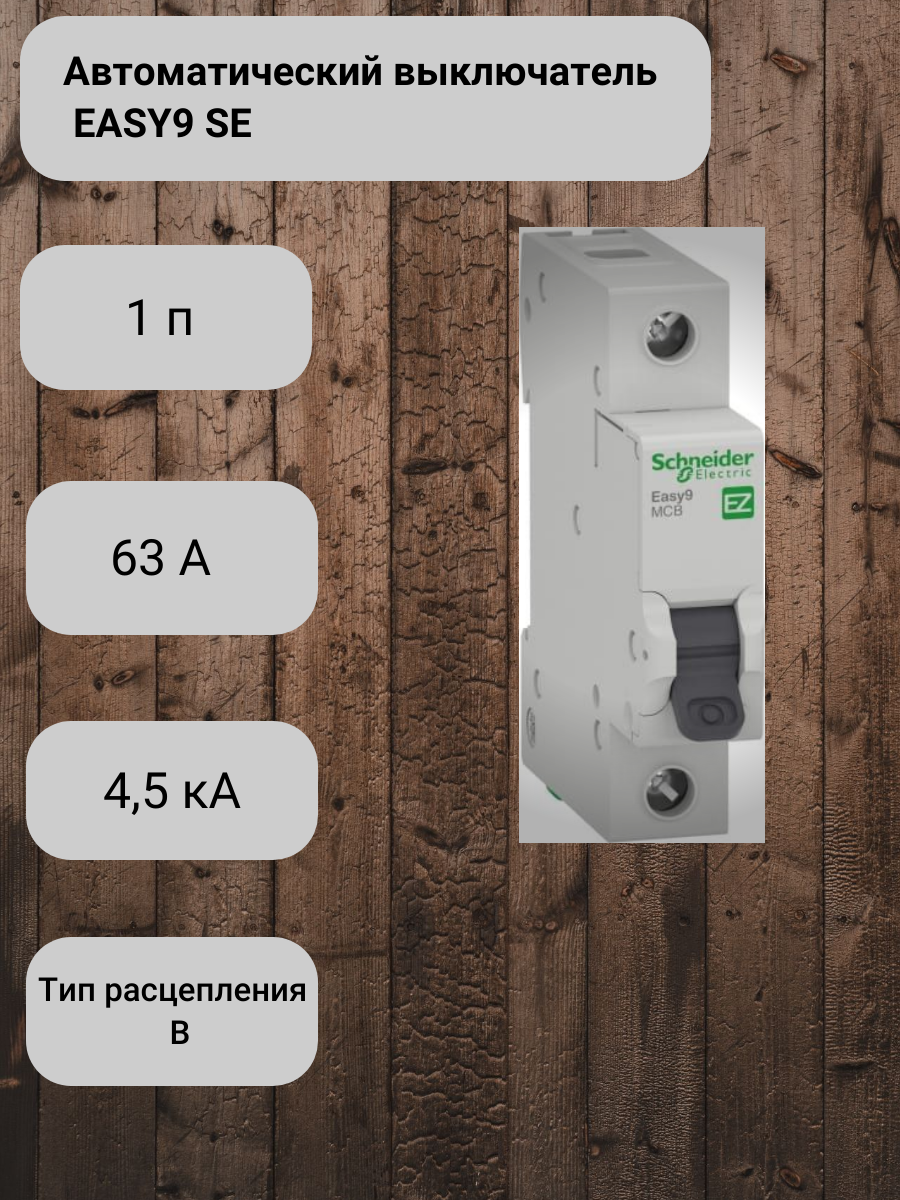 Автоматический выключатель Schneider Electric Easy9, 1 полюс, 63A, тип B, 4,5kA информация: