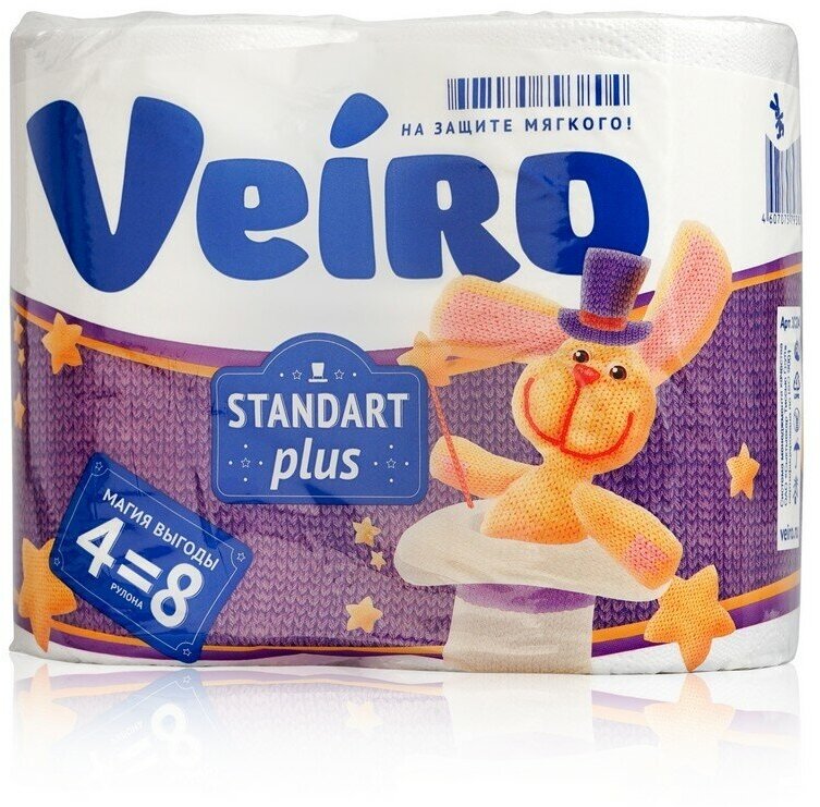 Бумага туалетная Veiro бытовая, спайка 4 шт, 2-х слойная (4х30 м), Standart Plus, белая (3с24)