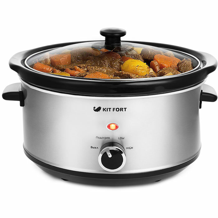 Медленноварка Kitfort KT-208, 280 Вт, емкость кастрюли 4,5 л, с механическим управлением, 3 режима, термостойкие ручки, цвет серебристый