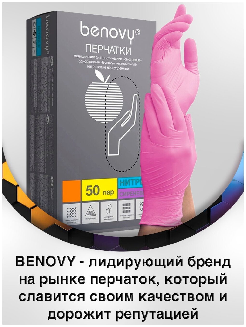 Перчатки медицинские Benovy, нитриловые, неопудренные, нестерильные, размер M, 50 пар, сиреневые