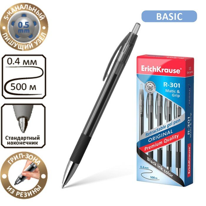 Ручка гелевая ErichKrause R-301 Original Gel Matic & Grip стержень чёрный, 0,5 мм, автоматическая(12 шт.) информация: