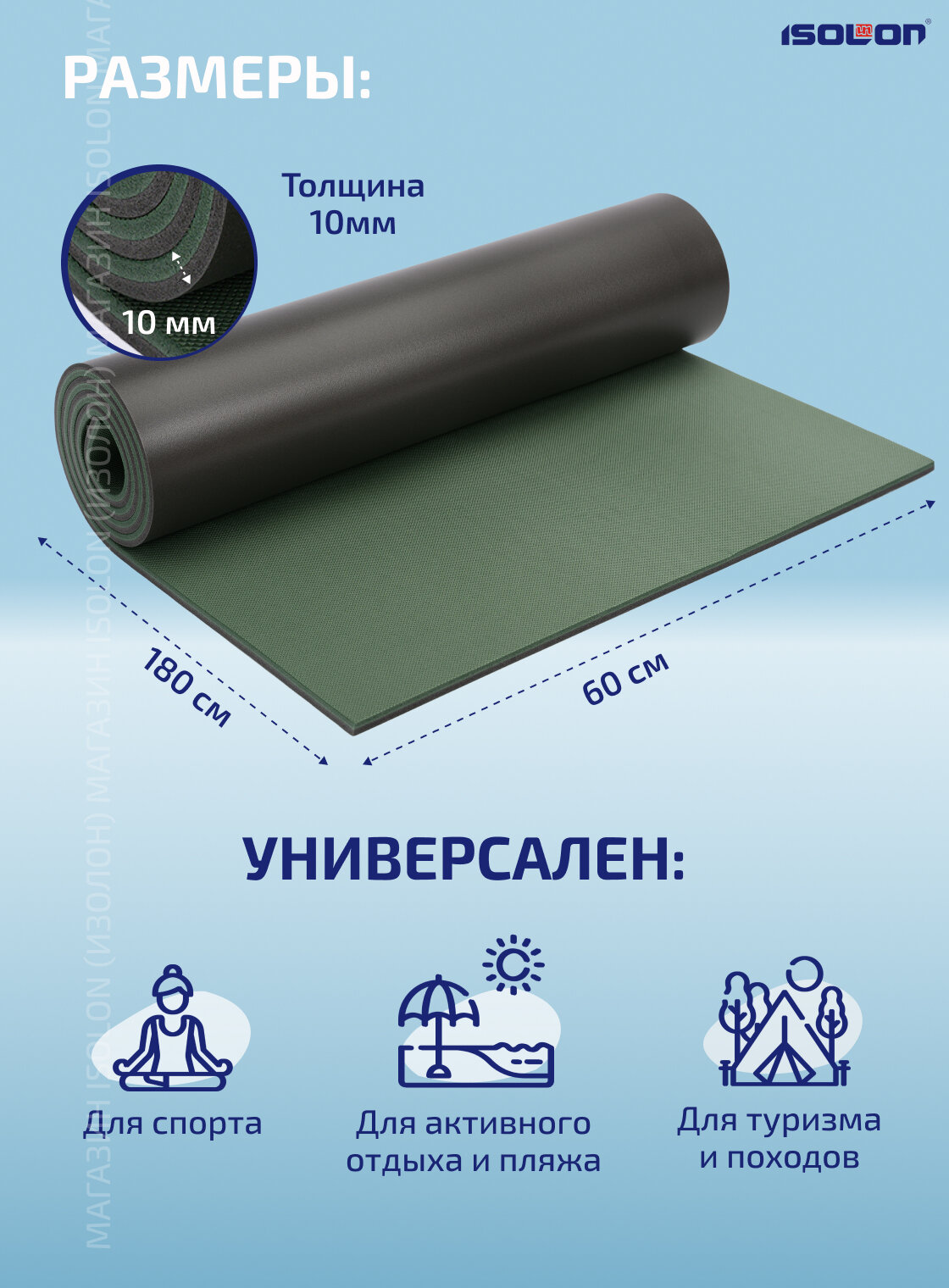 Отзывы на Коврик спортивный для фитнеса и йоги Isolon Sport 10 мм, 180х60 см серый/хаки