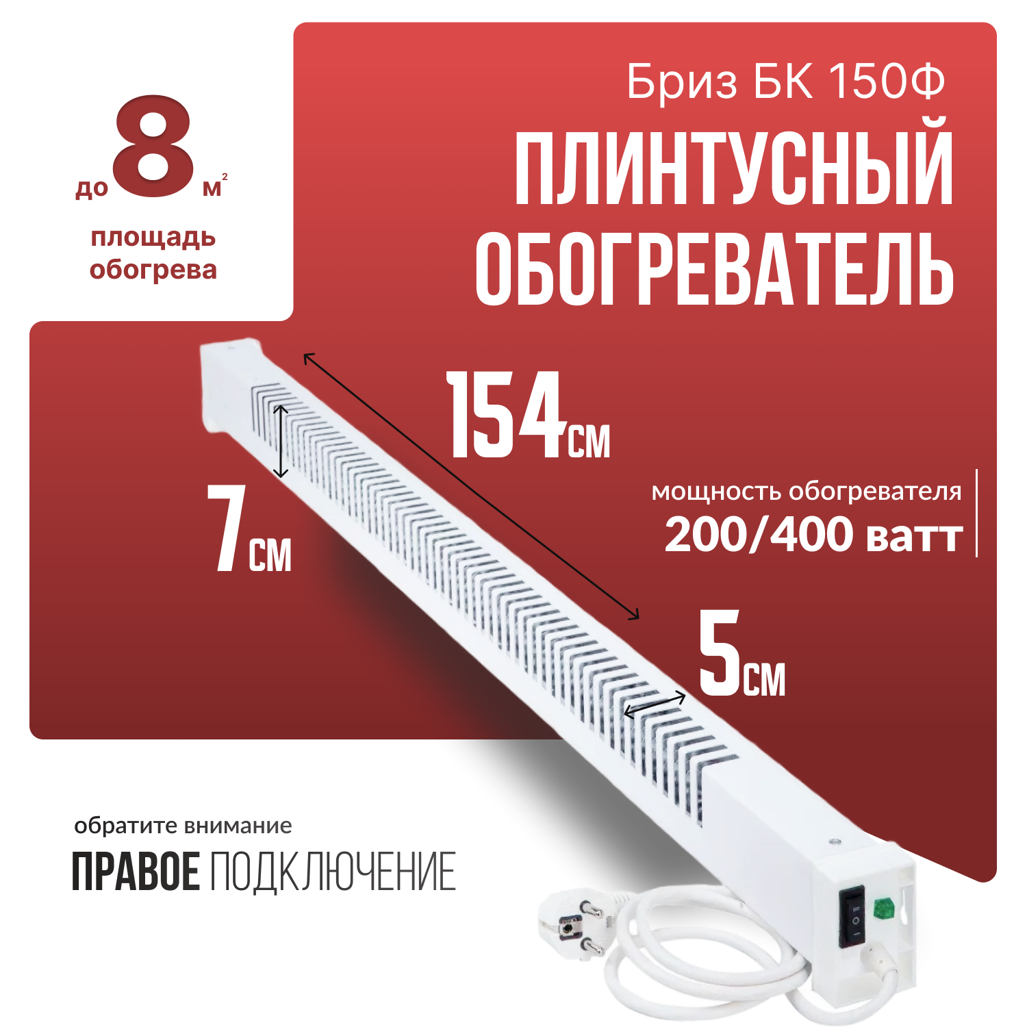 Обогреватель плинтусный Бриз БК 150Ф, белый, вилка справа информация: