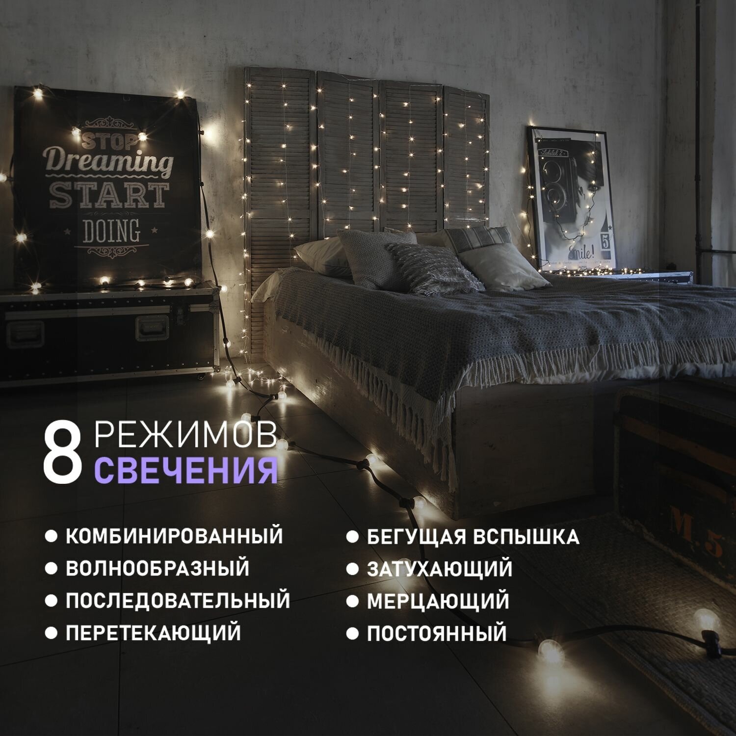 Гирлянда «Нить» 7 м, IP20, тёмная нить, 180 ламп, свечение тёплое белое, 8 режимов, 220 В, 187157