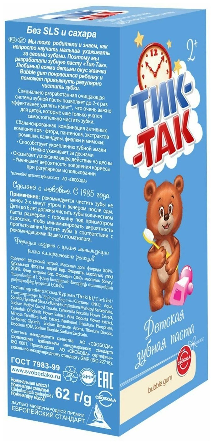 Зубная паста свобода Тик-Так bubble gum 2+, 62 мл, 62 г информация: