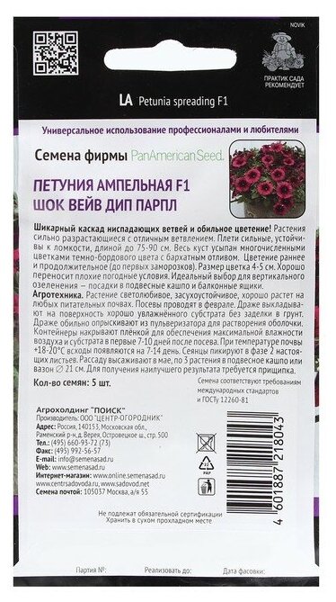 Семена Петуния "Поиск" Шок вейв Дип парпл F1 ампельная 5шт